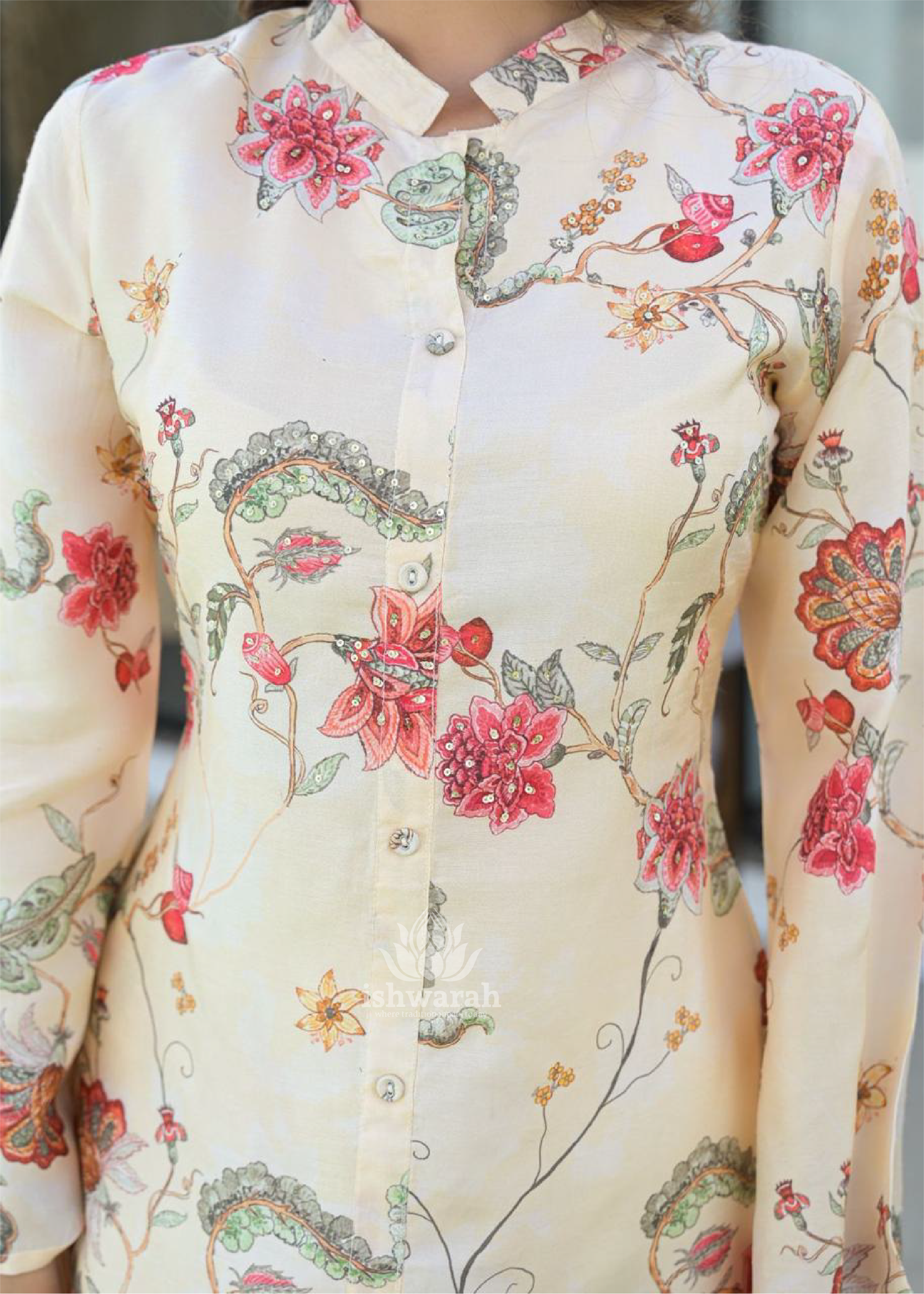 A whisper of tradition, tailored for today. Varnika embodies the spirit of Sanskrit elegance in a contemporary silhouette—perfectly poised between East and effortless. Crafted in breezy cotton silk, this two-piece co-ord set brings together structured tailoring with hand-drawn-style floral prints that echo the brushstrokes of a bygone miniature painting. |