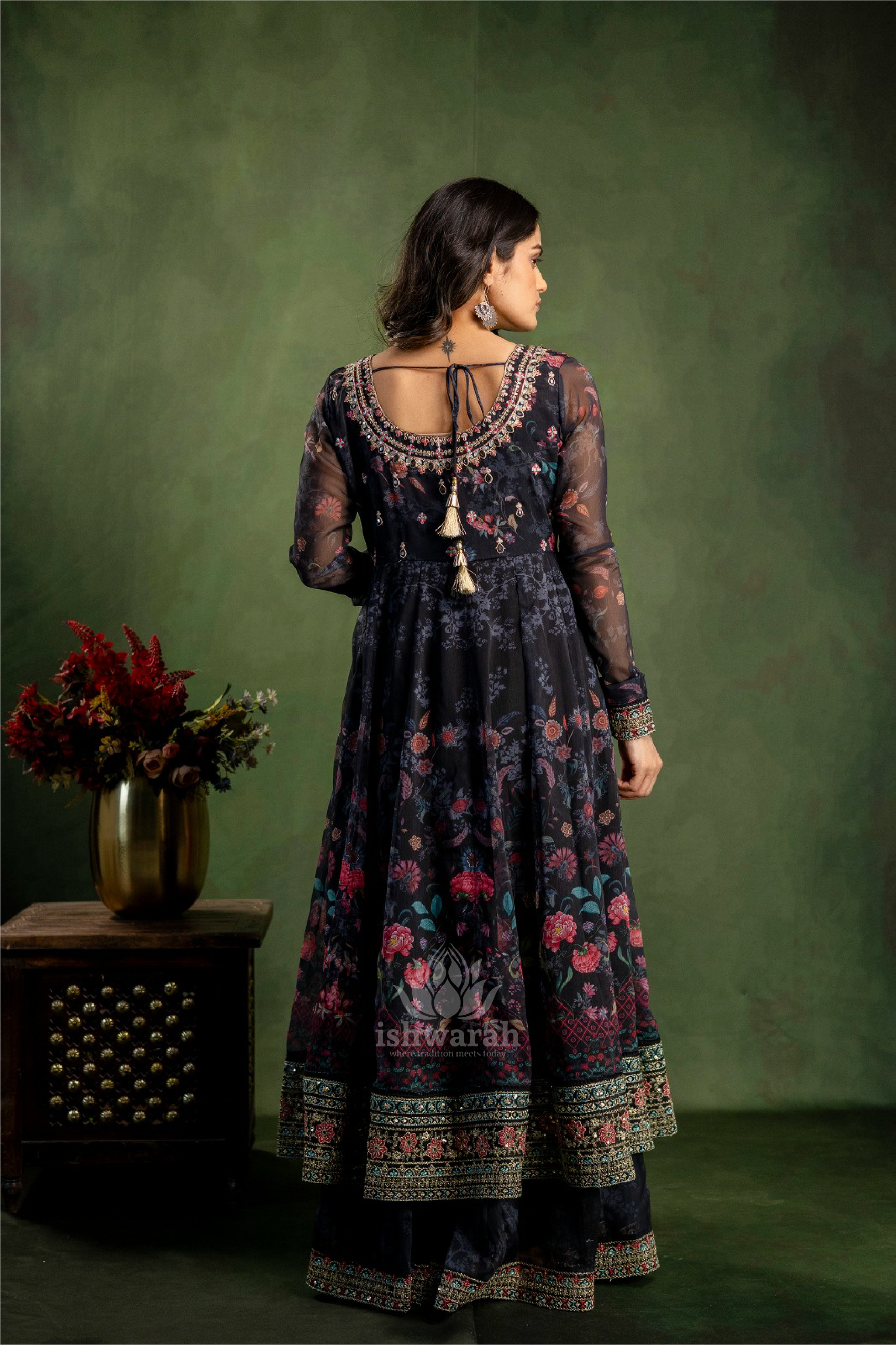 | Step into timeless allure with Raag Shyaamal — a midnight-hued Anarkali that shimmers like a moonlit garden. Crafted in soft shimmer fabric, this regal silhouette is adorned with all-over floral motifs and intricately embroidered borders that evoke Mughal opulence. The neckline is accentuated with jewel-toned thread and mirror work, while the sheer flared sleeves and the flowy dupatta complete the ensemble with an air of vintage romance. |