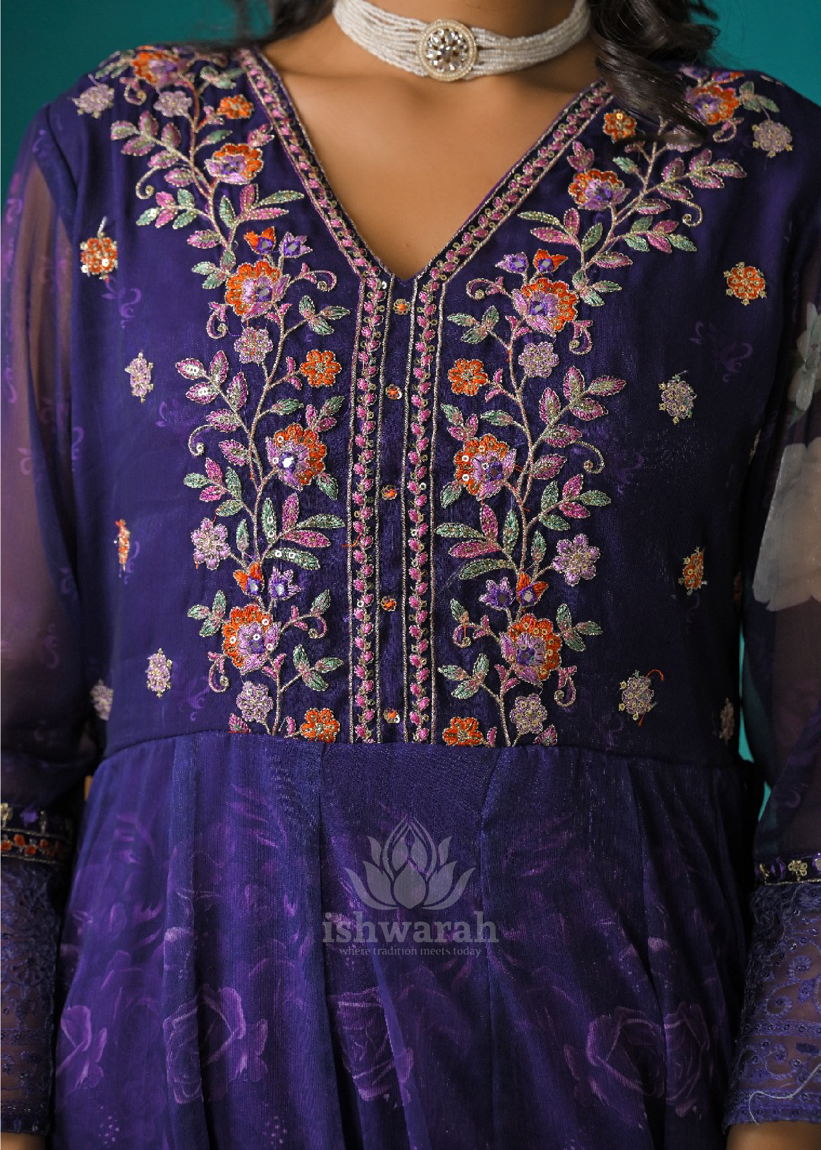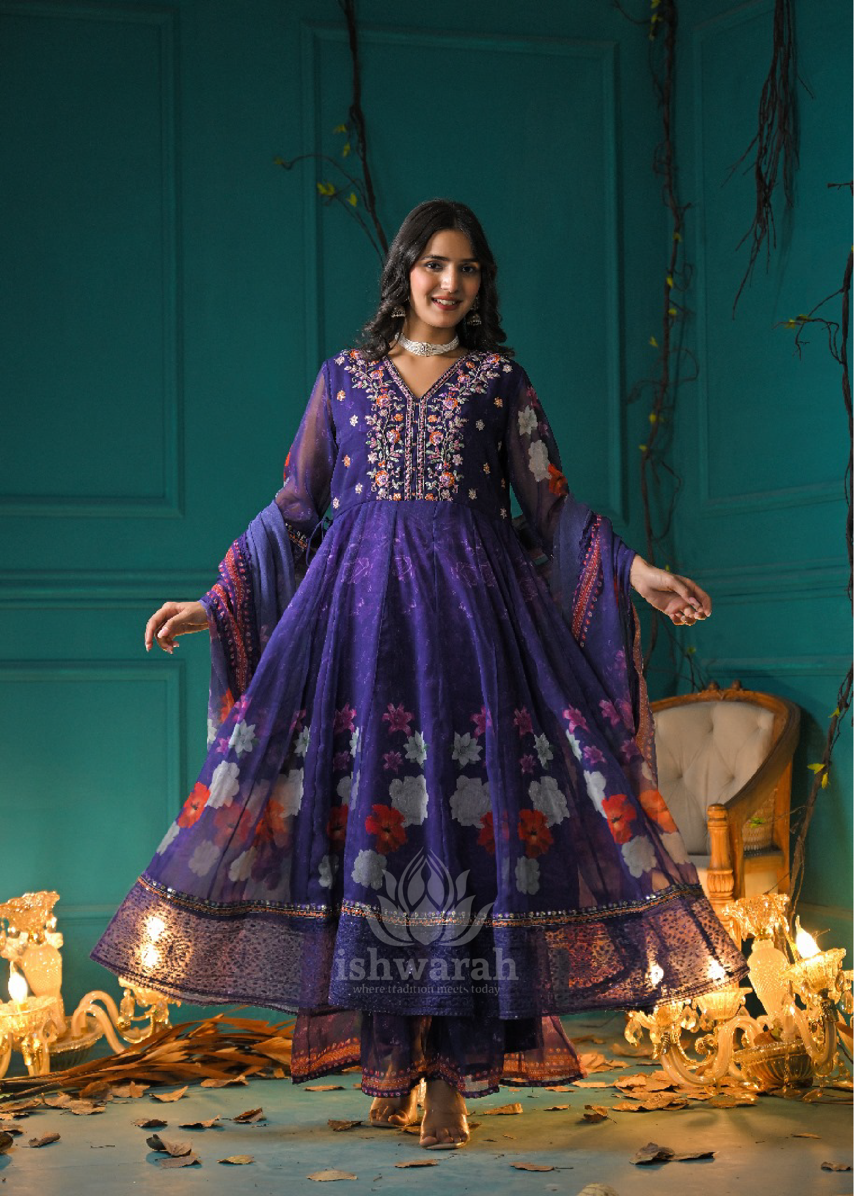 | Let your spirit bloom with Raag Neelpushpi — a midnight violet Anarkali that mirrors a starlit garden. Crafted in luxurious shimmer fabric, this flowy kalidaar is adorned with blooming floral motifs and rich embroidery along the hem, neckline, and cuffs. The sheer full sleeves and matching dupatta carry the same floral rhythm, making this a poetic ensemble perfect for twilight celebrations. |