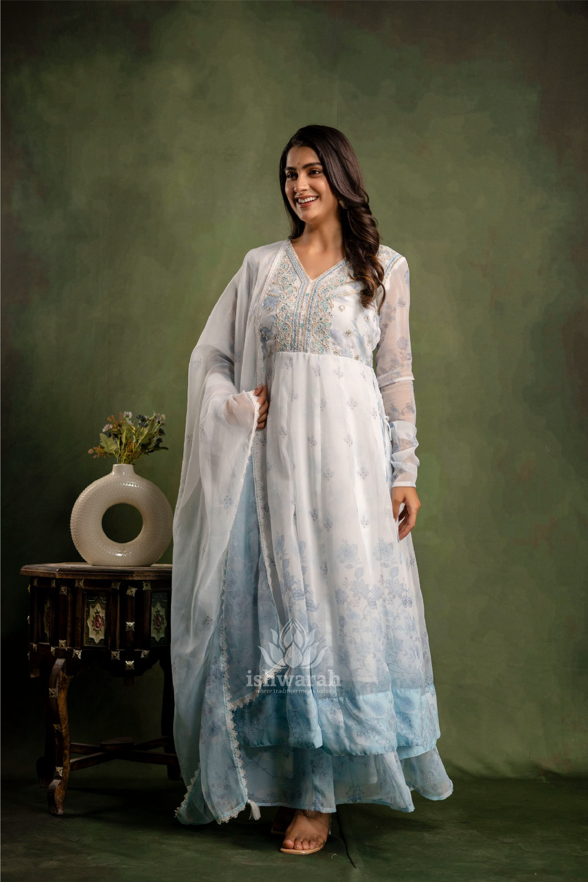| Induvani — moonlit and magical — is crafted for the gentle yet radiant soul. Rendered in soft shimmer fabric in the palest hue of sky-kissed blue, this flowing Anarkali exudes calm elegance and understated grandeur. |